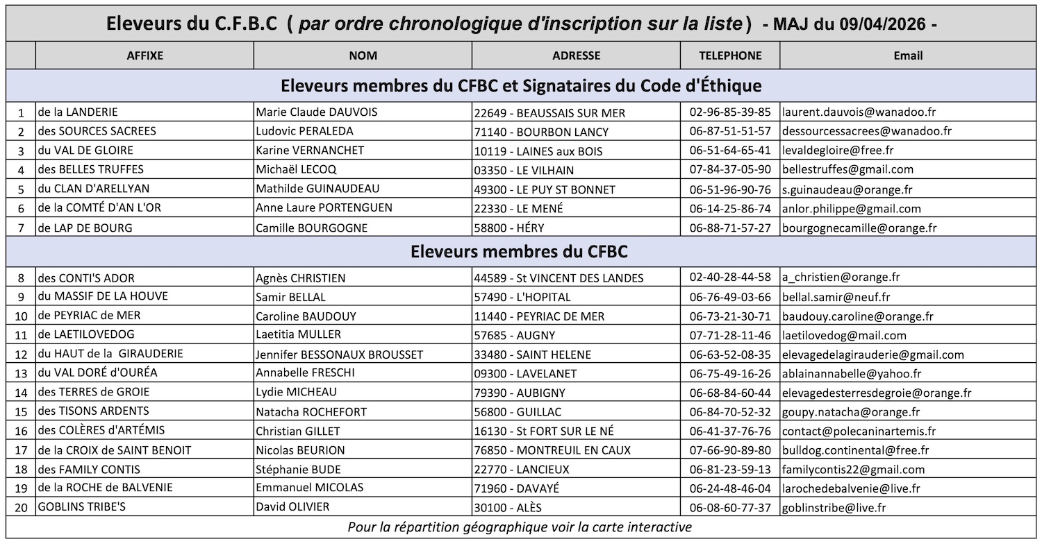 Cette liste d'éleveurs est communiquée sans engager la responsabilité du C.F.B.C