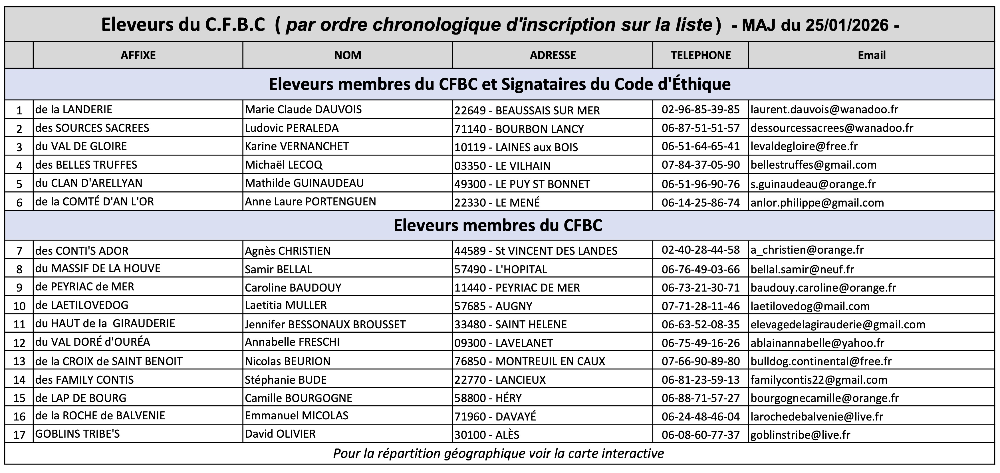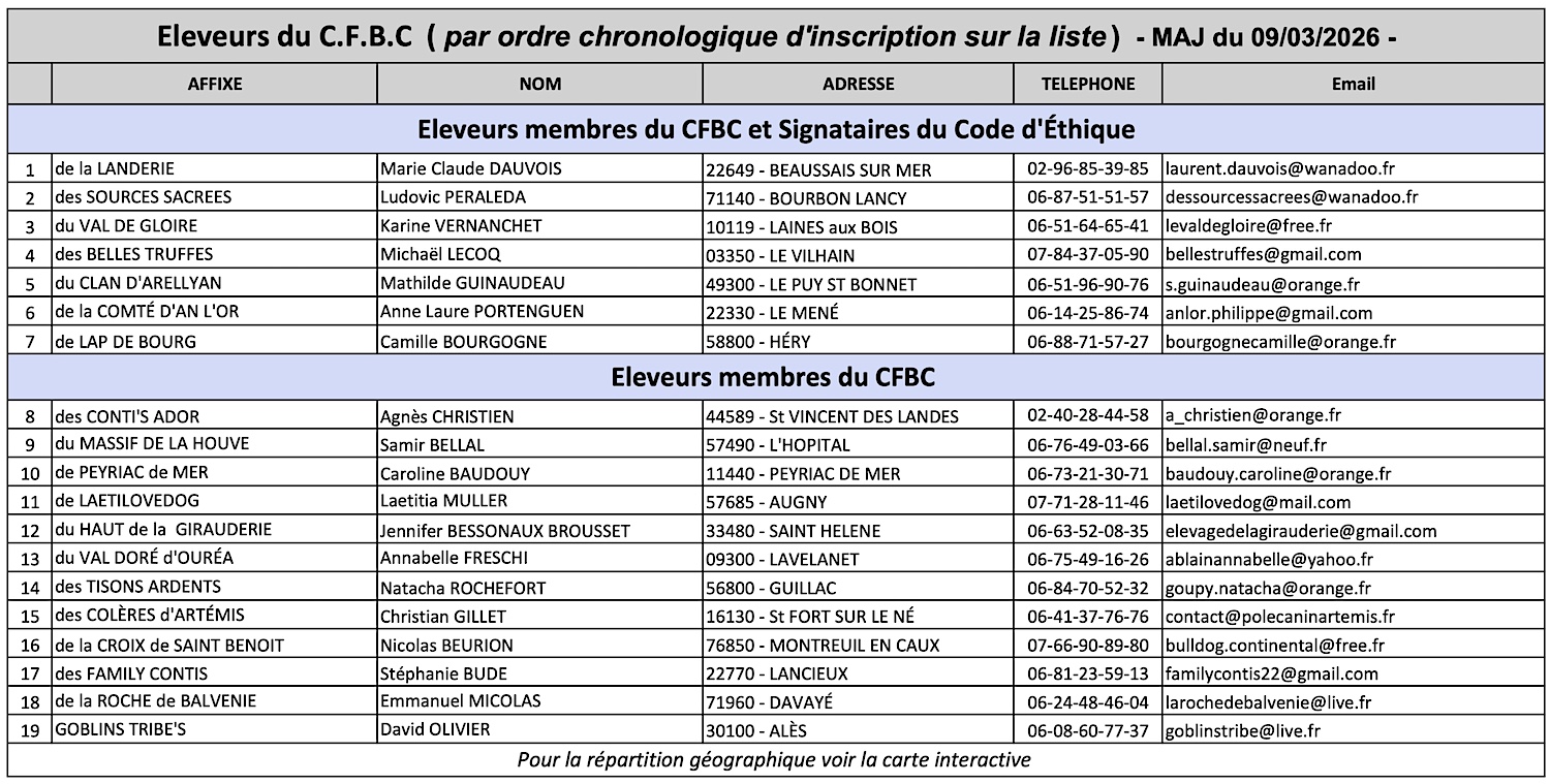 Cette liste d'éleveurs est communiquée sans engager la responsabilité du C.F.B.C